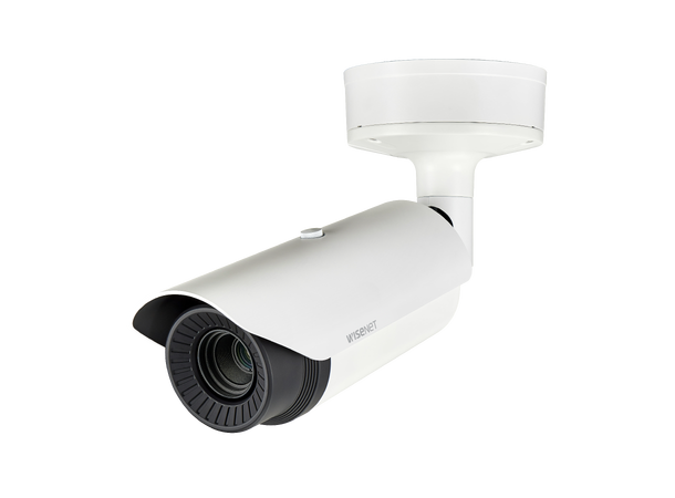 Wisenet T network outdoor thermal bullet camera, QVGA @30fps, 2.7mm fixed lens (92°), triple codec H.265/H.264/MJPEG with WiseStream II, Multiple streaming, Advanced Video Analytics and Sound Classification, Hallway View, Motion detection, Shock detection, Temperature detection, Handover, 7 colour palettes, Digital Image Stabilization with built-in Gyro Sensor, Bi-directional audio and microSD/SDHC/SDXC slot, IP66, IK10, Nema 4X, PoE/12VDC/24VAC